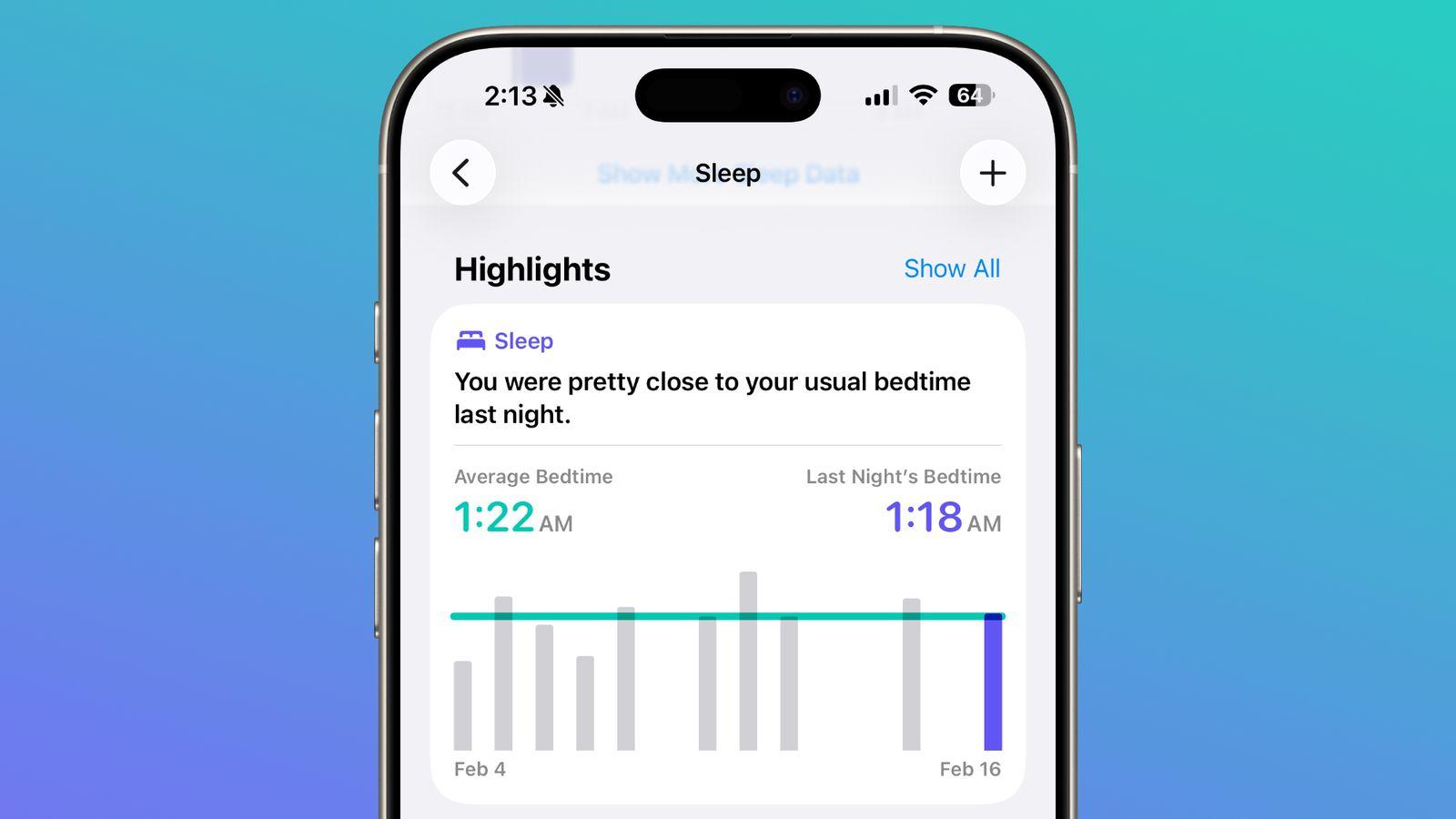 健康 App 睡眠监测 新增“平均入睡时间”统计,通过过去两周的数据分析你实际入睡的时间点与设定目标的偏差。