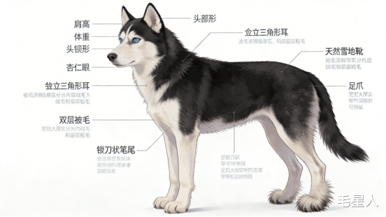 哈士奇属于中型工作犬,体型紧凑匀称,肌肉发达却不臃肿,每一处外貌特征都精准适配极地生存需求。根据AKC标准,成年公犬肩高53-60厘米,体重20-27公斤;成年母犬肩高51-56厘米,体重16-23公斤,整体呈“力量与敏捷并存”的体型比例,既保证拉动雪橇的牵引力,又能在复杂地形中灵活穿梭。