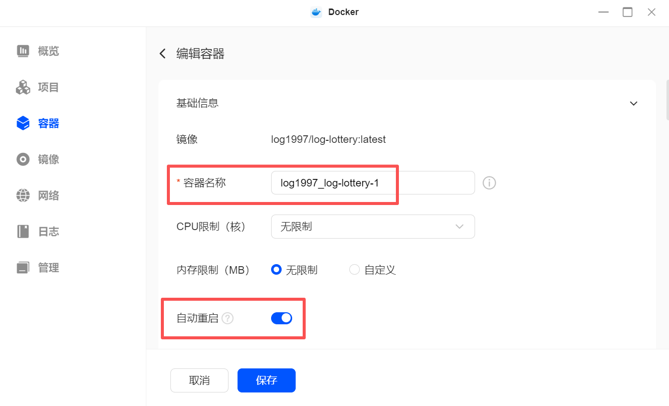镜像下载完成后,在【本地镜像】找到它,并点击【创建】容器,重点配置以下参数,其余的默认就行: