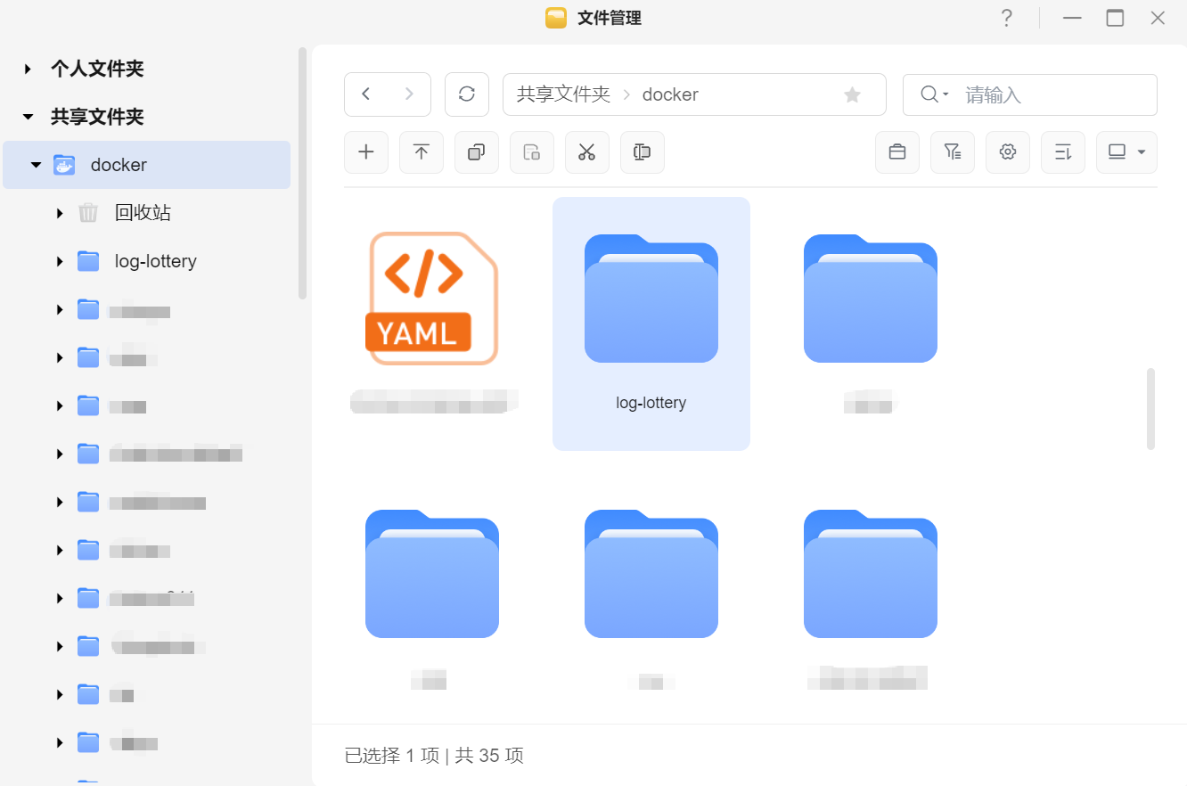 接着要建个专属文件夹,这步千万别漏!进入【文件管理】,在“共享文件夹/docker”目录下新建“log-lottery”文件夹,这一步很关键,是为了配置的文件能更好地记录和存储,不然容器一重启,之前录的名单、设的奖品全没了,返工超麻烦。