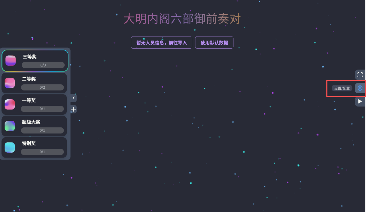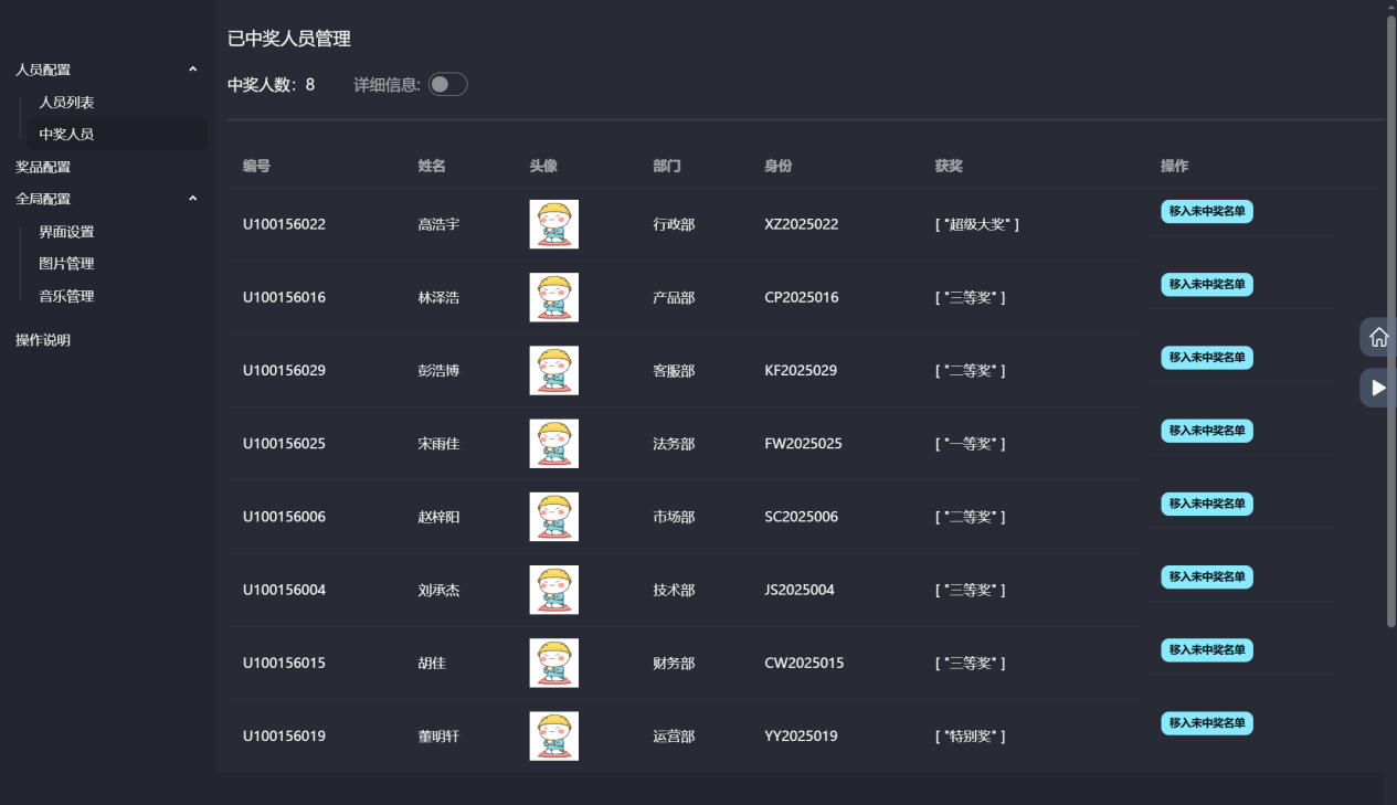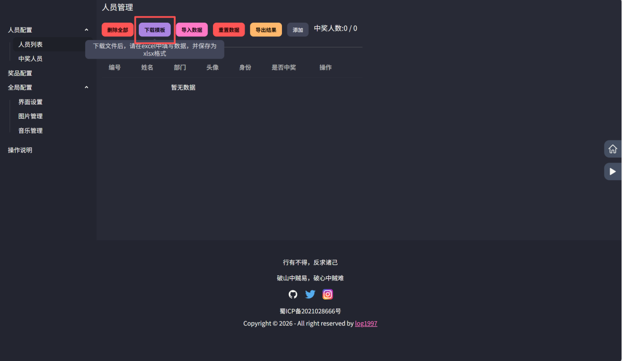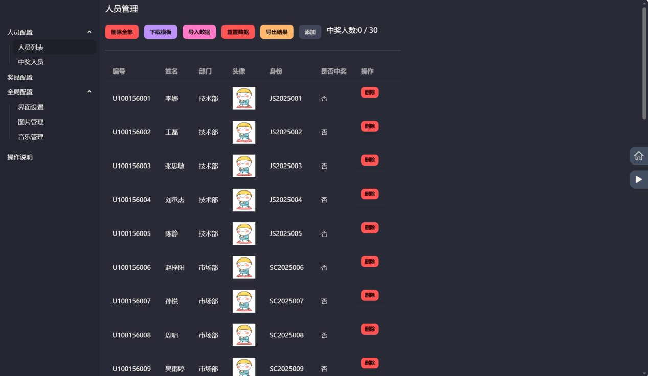 进入界面后,点右侧的【设置/配置】,先去【人员管理】界面弄好名单,点击“下载模板”,按Excel格式填写人员信息,支持批量导入数百人名单,而且已中奖人员会自动标记,不用担心重复中奖,统计起来特别方便。