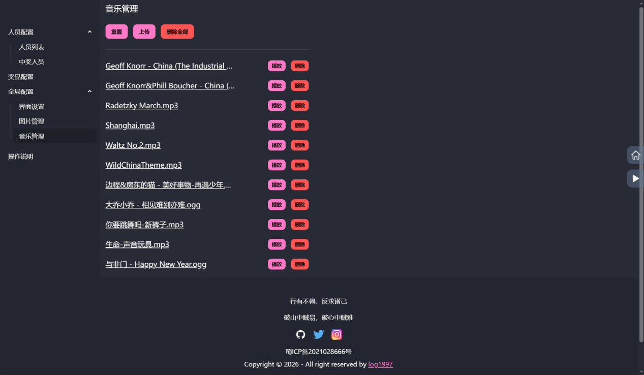 【图片管理】可以加些趣味表情包、年会主题图烘托气氛,【音乐管理】也很关键,可上传年会暖场音乐、抽奖激昂音效,播放时自动适配流程,仪式感直接拉满。