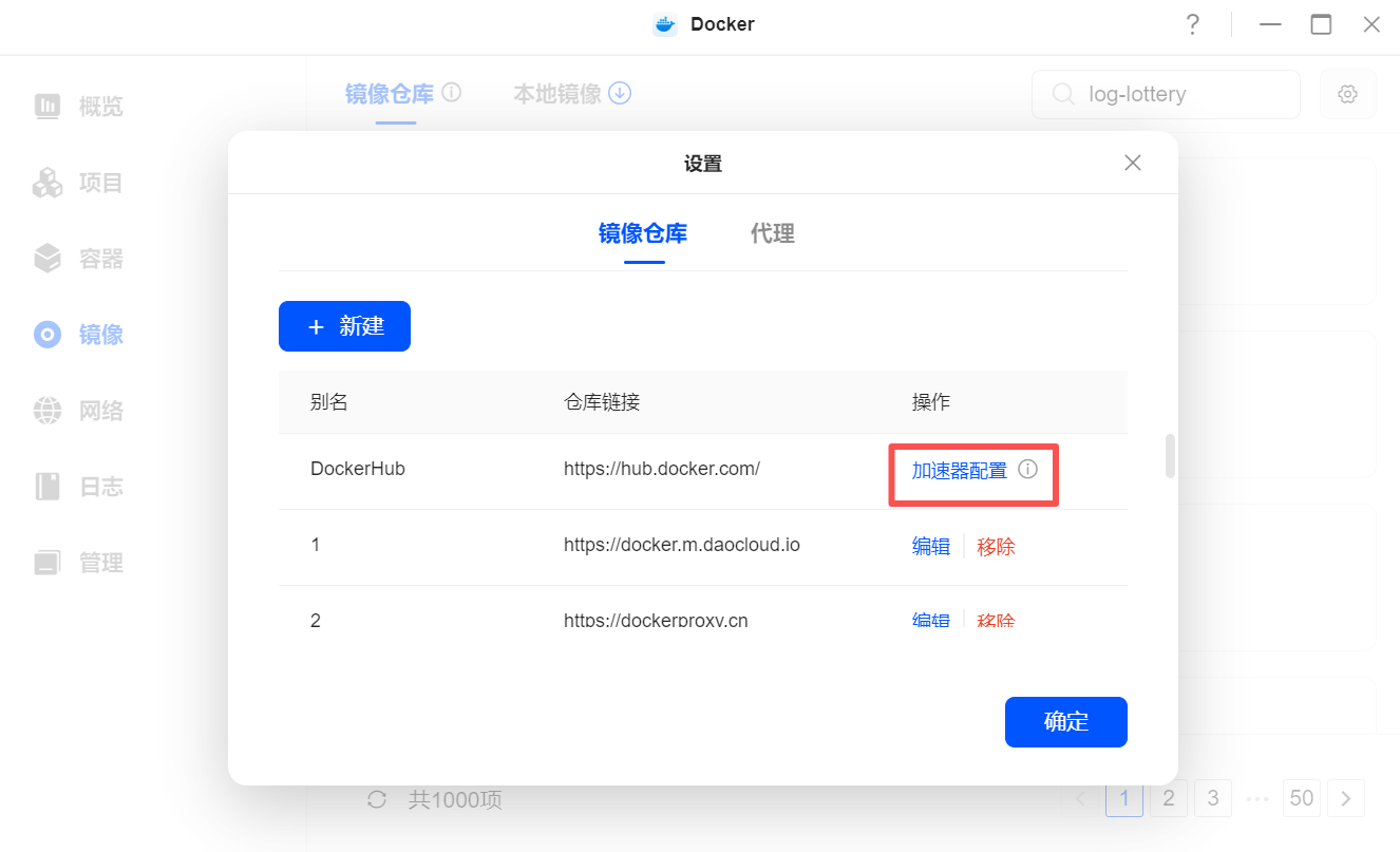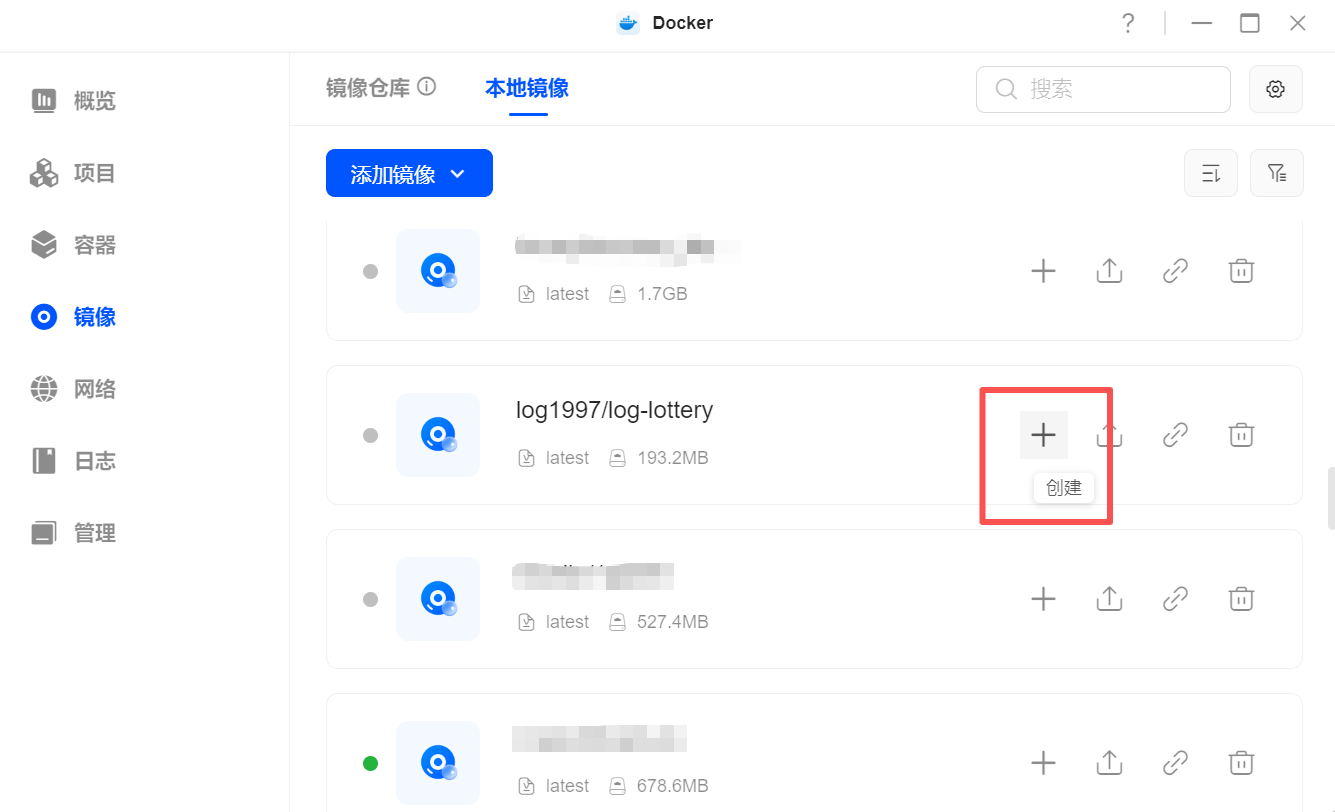 然后就是下载镜像,打开Docker管理界面,找到【镜像】栏,在右上角搜索框输入“log-lottery”,选择官方镜像 “log1997/log-lottery”等待下载就行。