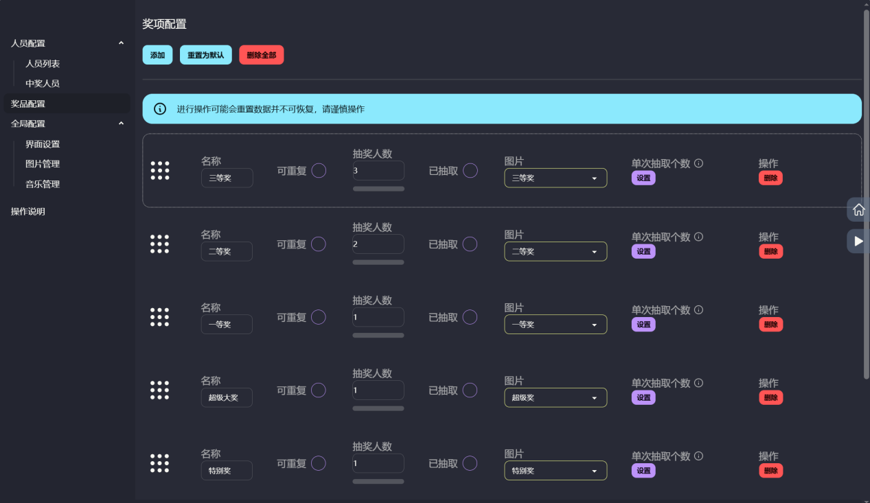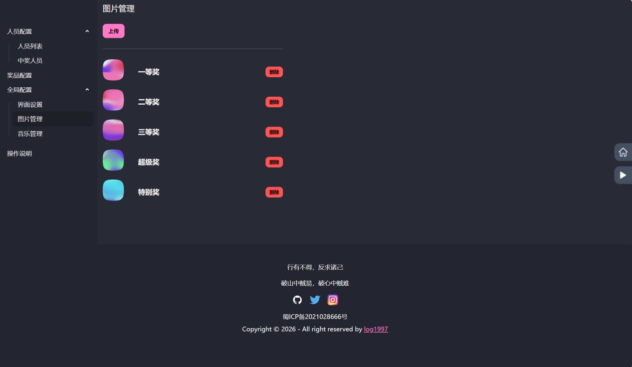 再来搞定【奖品配置】,这是最能调动氛围的环节!可以按需设置层级,比如特等奖、超级大奖、一等奖等等,也能直接填“品牌笔记本电脑”、“年终奖翻倍券”、“带薪年假”这类吸睛奖项,设置对应数量和中奖概率,还能上传奖品高清图,视觉效果更棒。
