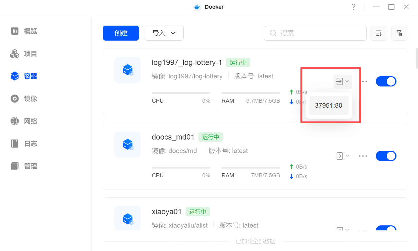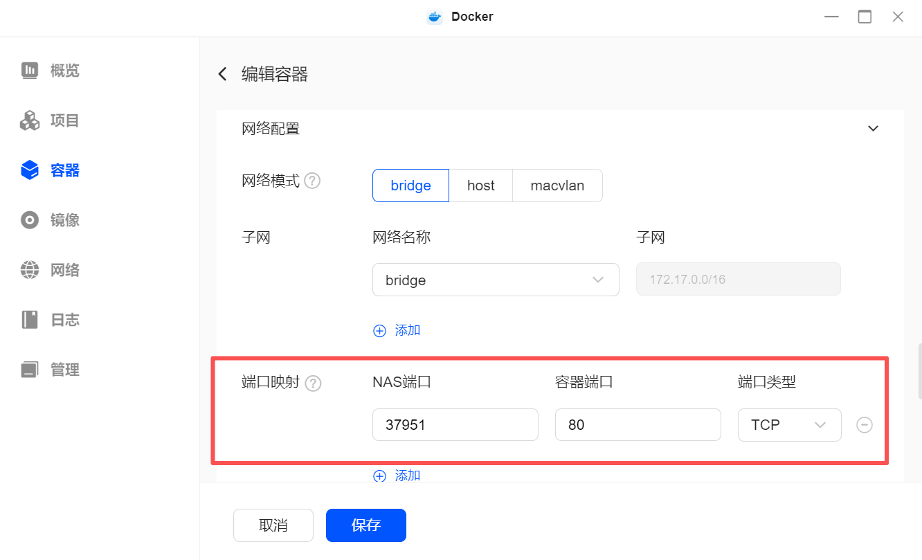 端口映射:NAS端口会自动生成一个空闲的随机端口,也可以自定义一个未被占用的,避免和其他的冲突,容器端口固定填“80”,确认无误后保存,容器就部署成功啦。