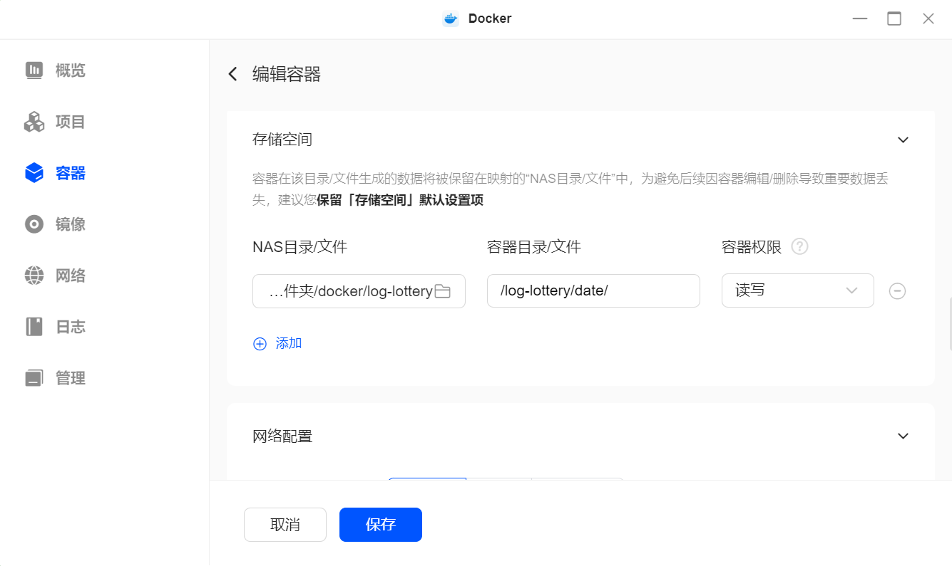 存储空间:点击【添加】,选择自己之前创建的文件夹存放路径即可,数据能稳稳保存好。NAS目录/文件是绿联NAS本地的真实文件夹/文件,点击右侧文件夹图标,逐层找到「共享文件夹→docker→log-lottery」就可以,这个就是我实操的存储位置。容器目录/文件是Docker容器内部的虚拟路径,需要自己手动输入,我填的是/log-lottery/date/,容器权限直接下拉选择读写,确保数据可正常写入和保存。以上是我个人的文件存放路径,大家按流程填自己的真实路径就好啦。