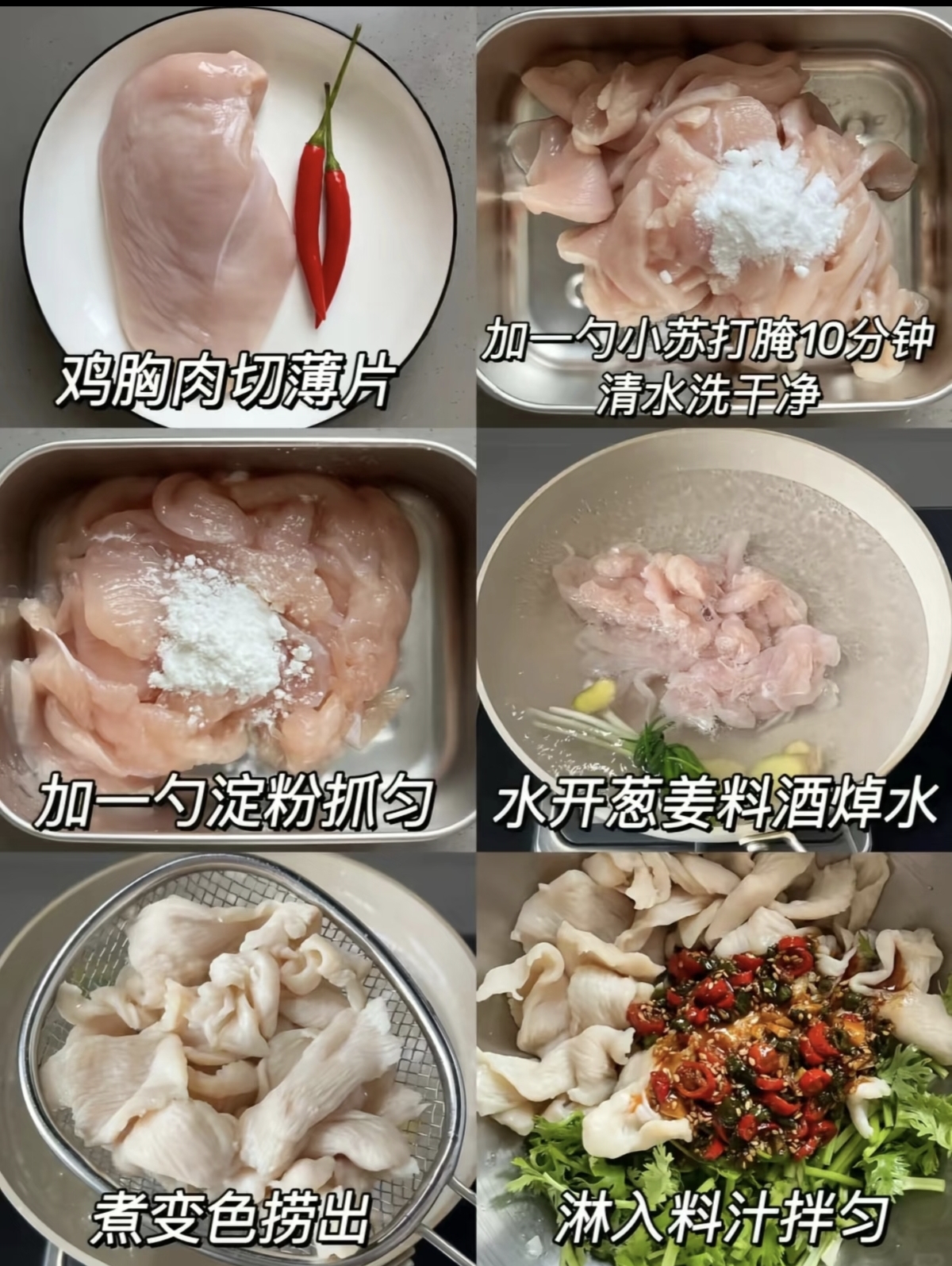 这道菜的灵魂在于鸡胸肉的处理。很多人觉得鸡胸肉柴,其实只要掌握了正确的方法,它也能变得鲜嫩多汁。首先,将鸡胸肉顺着纹理切成薄片,这样更容易入味,口感也更好。然后,关键的一步来了:加入一勺小苏打,轻轻抓匀,腌制十分钟。小苏打是嫩肉的秘诀,它能破坏肉的纤维,让鸡胸肉变得异常松软。腌制时间到后,一定要用清水将鸡胸肉冲洗干净,洗掉多余的小苏打,这样才不会影响后续的味道。