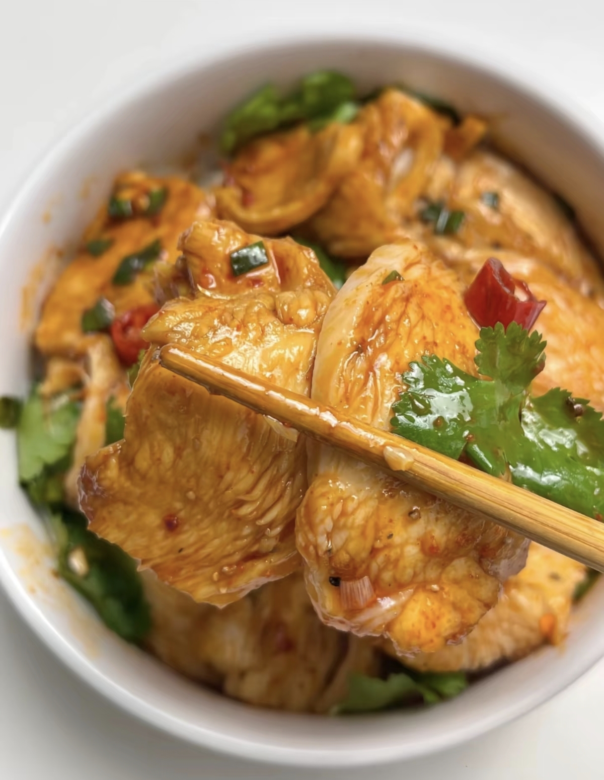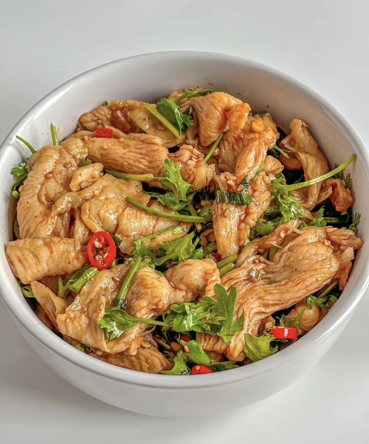将焯好水的鸡胸肉捞出,沥干水分,放入一个干净的大碗中。然后,将调好的料汁均匀地淋在鸡胸肉上。用筷子或者勺子轻轻翻拌,确保每一片鸡肉都裹满了浓郁的料汁。