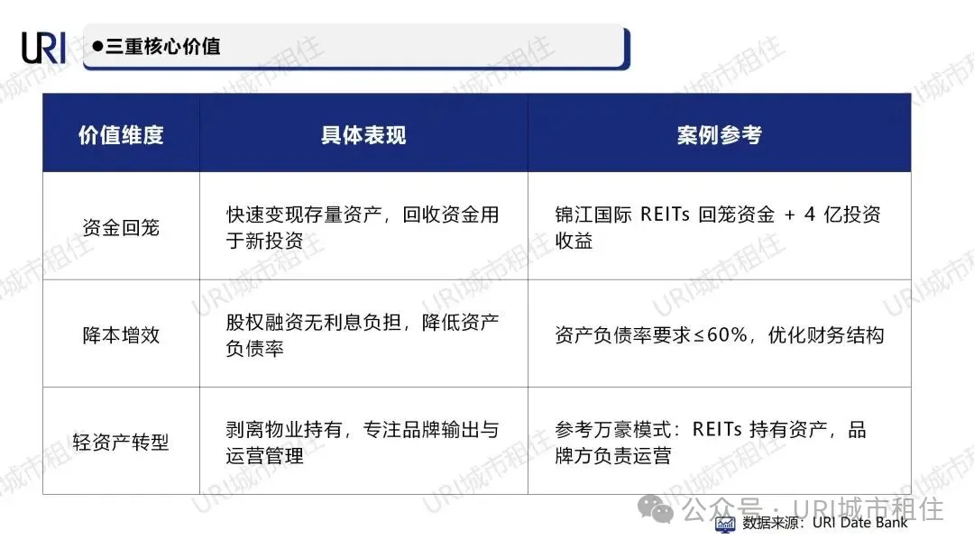 运营能力价值化:REITs以收益法估值,酒店净营业收入(NOI)直接决定资产价值,倒逼企业从“重建设” 转向 “重运营”,提升服务质量与盈利能力。