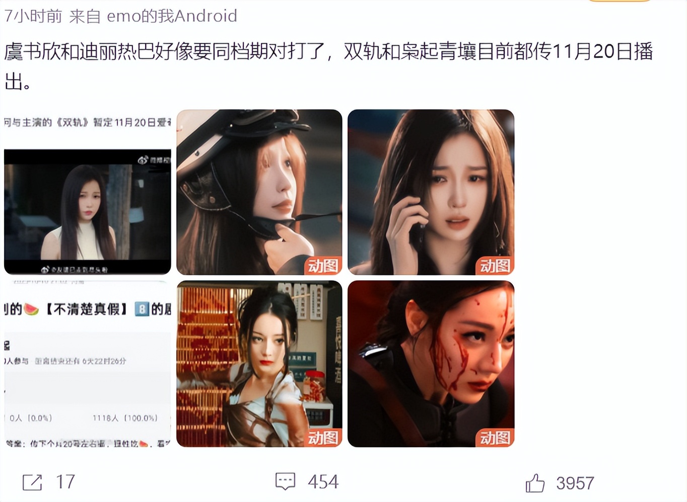 近日,网上突然传出消息,虞书欣的新剧《双轨》将对打迪丽热巴的新剧《枭起青壤》,这两部剧都将在11月份播出,《利剑玫瑰》播出后,很多网友都认为迪丽热巴转型成功,因为在这部剧中,迪丽热巴的演技有明显的进步,最关键的是,这部剧取得的成绩非常亮眼。