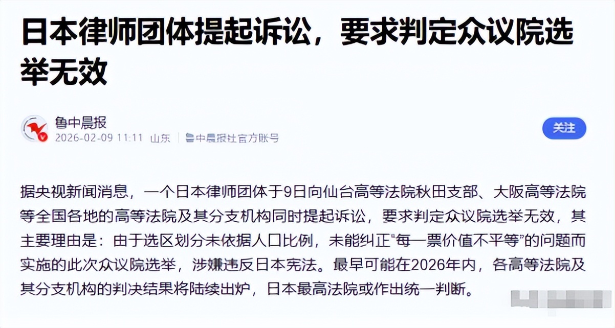 大选结果公布不到48小时,也就是2月9号清晨,日本各地律师团体同步向仙台高等法院秋田分院、大阪高等法院等多家机构递交诉状,将高市早苗及相关选举机构一并起诉,核心诉求只有一个:判定2月8号的众议院选举无效,重新投票。