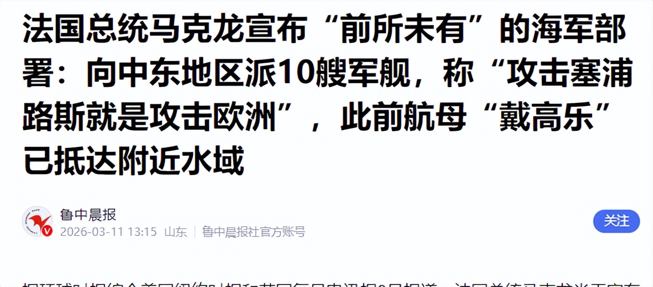 先说说这11艘军舰的来头,里面不仅有戴高乐号航空母舰,还有护卫舰、两栖攻击舰等多种类型,组成了一个完整的航母打击群,早在3月9号,戴高乐号就已经抵达塞浦路斯附近海域,马克龙还亲自飞到塞浦路斯,和希腊总理、塞浦路斯总统会面,商量东地中海的安全问题,之后又登上戴高乐号视察,强调这次行动是“防御性质”,目的是“维护霍尔木兹海峡的航行安全,保障国际能源供应通道畅通”。
