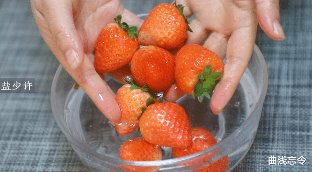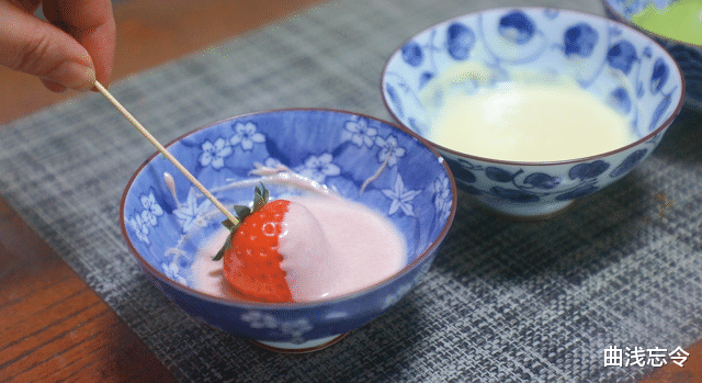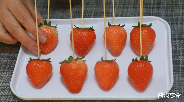 1、处理草莓:新鲜草莓选外形整齐美观高的8~10颗,清水中加少许盐,倒入草莓清洗干净,捞出后用厨房纸吸干表面残留水分。在每个草莓果蒂处都穿上竹签备用。