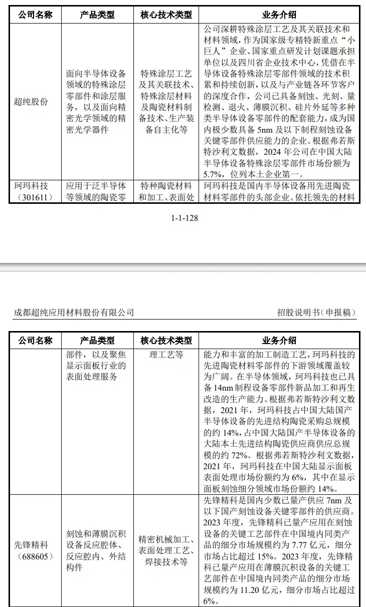 超纯股份是一家专注于特殊涂层工艺及其关联技术和材料的国家级专精特新重点“小巨人”企业,主要面向芯片制造、精密光学等领域,提供经材料改性、精密表面加工、精密清洗和特殊涂层工艺后的精密零部件产品及服务。
