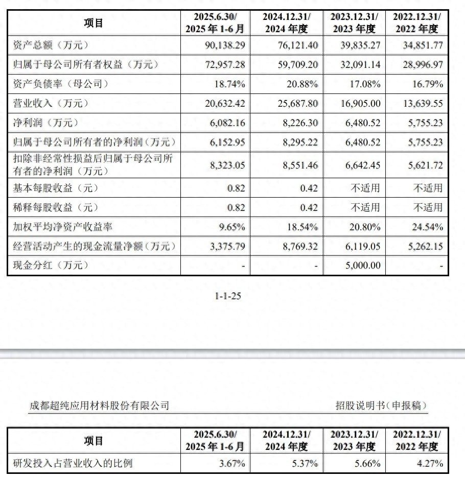 报告期内(2022年至2025年上半年),超纯股份的营业收入分别为1.36亿元、1.69亿元、2.57亿元、2.06亿元;净利润分别为5755.23万元、6480.52万元、8226.3万元、6082.16万元。