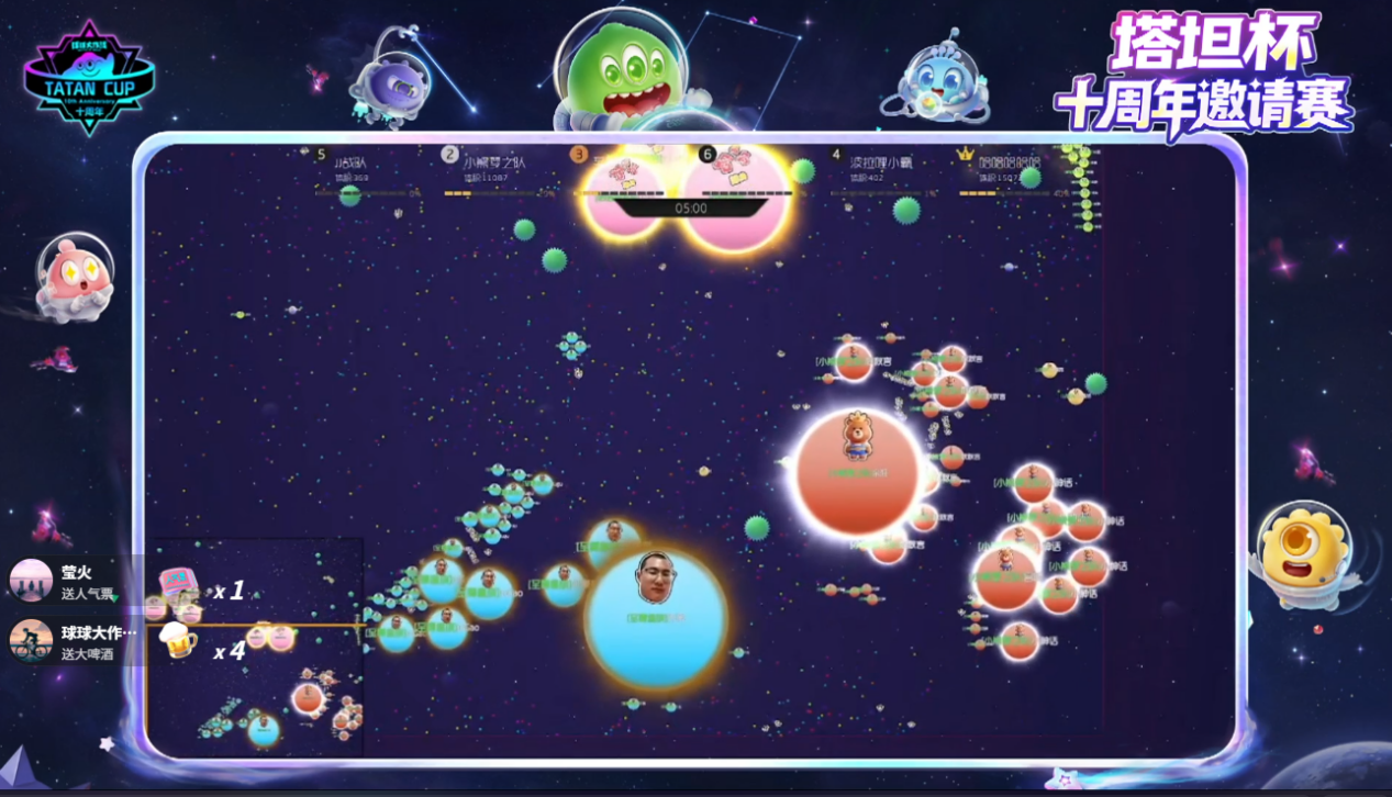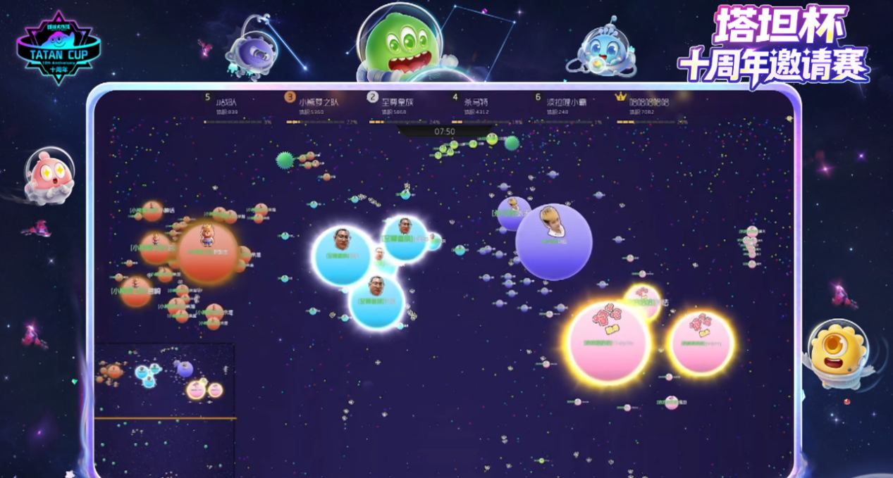 首先登场的,无差别混战简直是大型社死现场。有个选手紧张到把自己的球分成 16 瓣喂对手,这种“下饭操作”也能在顶尖玩家身上出现?但下一秒又被惊到——他故意把大球藏在刺堆里,用小分身勾引对手进来,等对手撞刺分裂时突然冲出,一套操作行云流水。于是乎弹幕一起刷 “对不起刚才笑太大声了”。