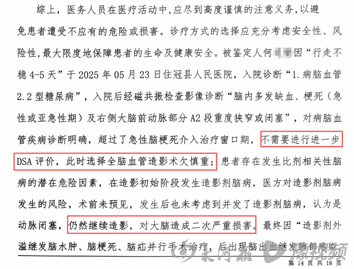 鉴定意见认为,何奎急性脑梗发病已有4-5天,已超过静脉溶栓及急性脑梗死介入治疗窗口期,且核磁共振检查已明确诊断,其脑内多发缺血梗死及右侧大脑前动脉重度狭窄或闭塞,不涉及后续治疗策略选择,无需进一步行DSA评价。医院此时选择全脑血管造影术“欠慎重”,属于诊疗不当。