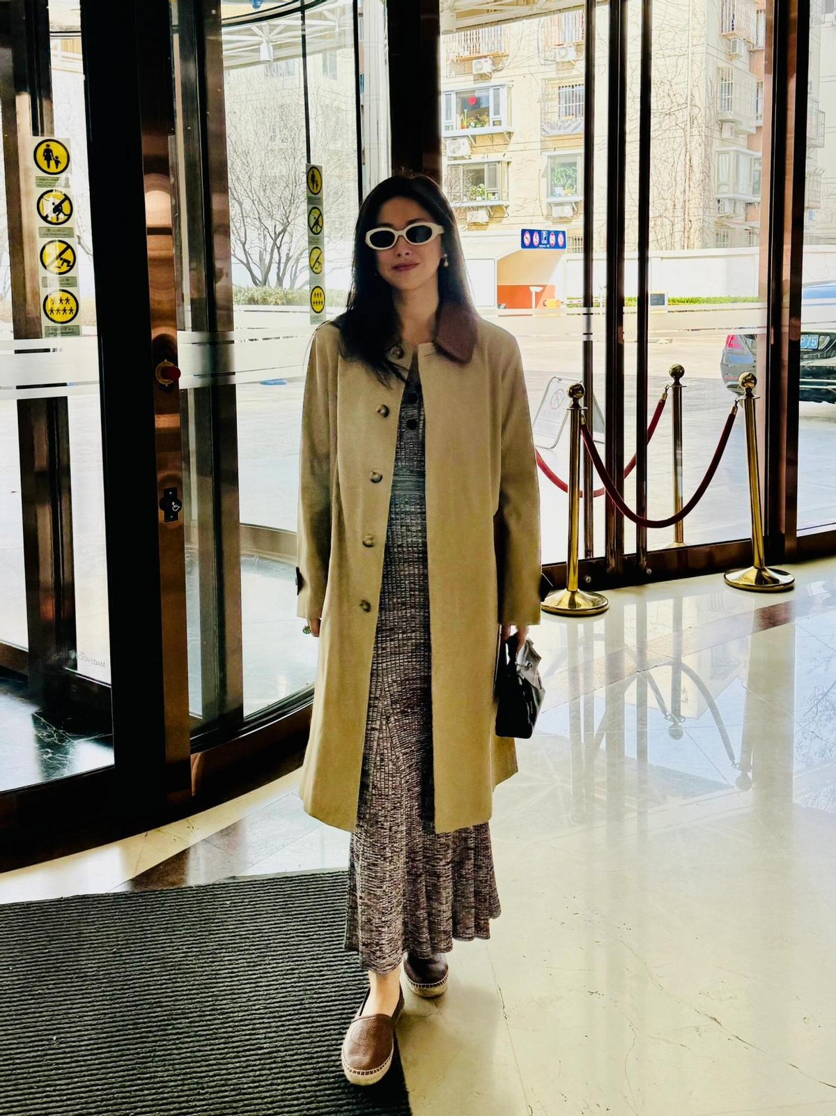 还有这一身棕色大衣搭配针织连衣裙,连衣裙的垂坠感中和了大衣的厚重,露出脚踝则拉长了腿部线条,整套搭配没有多余元素,却凭借材质与版型的和谐,把复古优雅的气质拿捏得恰到好处。
