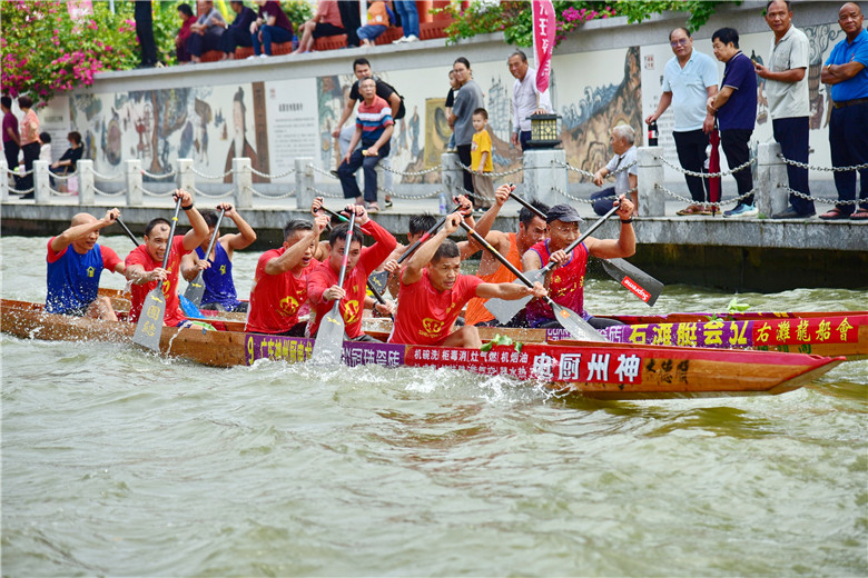 “咚!咚!咚!”鼓点如雷,桨叶如飞。各参赛队伍使出看家本领,喊着号子,奋力挥桨,水面上顿时掀起层层巨浪。
