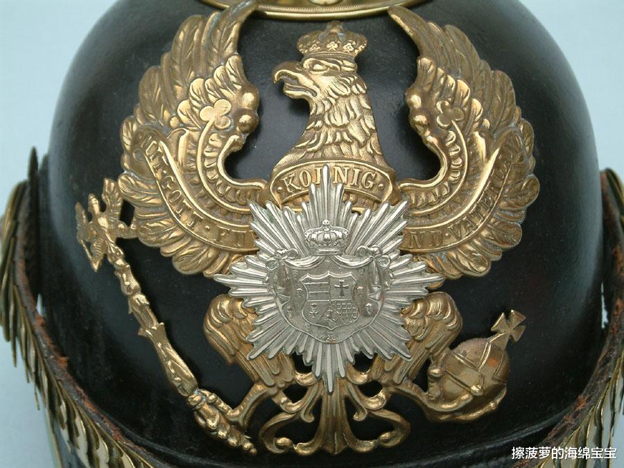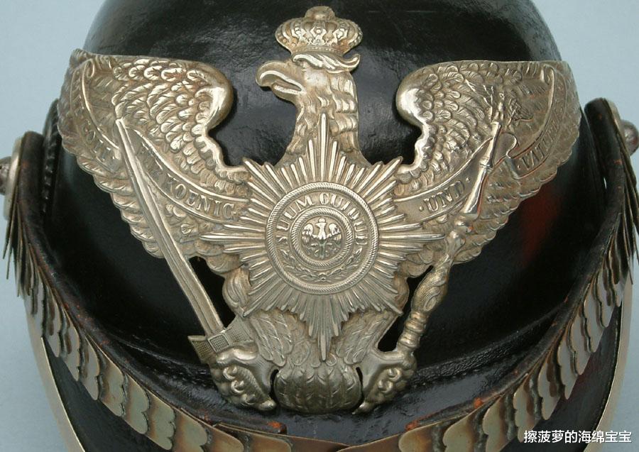 普鲁士近卫部队的鹰徽,中间是近卫之星。事实证明,1867式鹰徽的固定方式存在很大的缺陷,所以尖顶盔再次利用带螺纹螺栓和螺母进行加固。