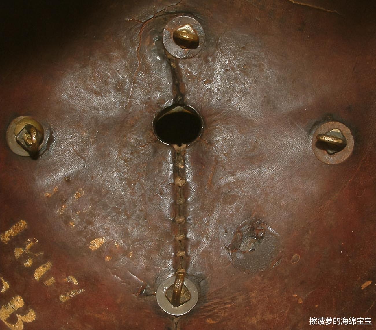 尖顶盔后部有一条从尖顶底座一直延伸到后帽檐的黄铜帽脊,帽脊用两颗螺栓固定,增加强度和硬度。从上一张内衬图中可以看到黄铜帽脊一直延伸到了后帽檐的内部,并用一颗螺栓固定住。黄铜帽脊还有一个作用就是遮盖了尖顶盔后部拼合的接缝处。