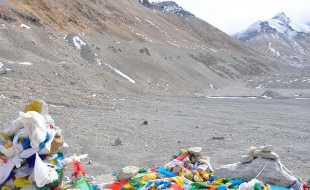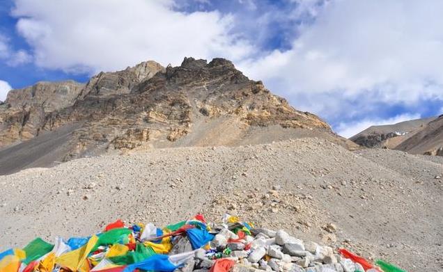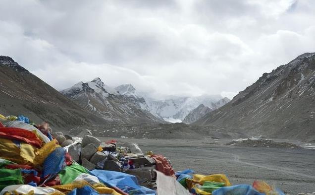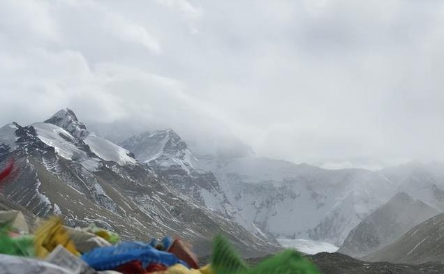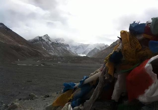 大本营再向前一点有一个几十米高的小山包观景台,站在观景台仰望世界最高峰——珠穆朗玛峰,珠峰山体就像一座巨大的金字塔,巍然屹立在群峰之间,气势磅礴。这里风很大,空气更加稀薄寒冷。风吹经幡呼呼作响,像是珠穆朗玛的祝福