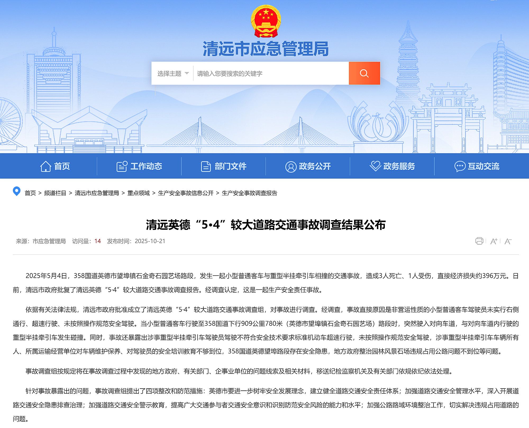 据悉,2025年5月4日,358国道英德市望埠镇石金奇石园艺场路段,发生一起小型普通客车与重型半挂牵引车相撞的交通事故,造成3人死亡、1人受伤,直接经济损失约396万元。日前,清远市政府批复了清远英德“5·4”较大道路交通事故调查报告。经调查认定,这是一起生产安全责任事故。