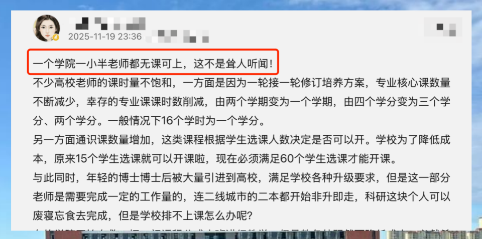 这种结构性矛盾背后,是多重力量的拉扯。一面是刚性的政策要求,公共课和思政课的学时是“规定动作”,动不得;另一面,是高校在资源约束下的精明计算——合并班级、提高开课人数门槛,都是降低成本最直接的方式。一位网友道破了其中的尴尬:“教务处要节约成本,必然希望合班上课。”三个及以上的教学班才能合并为一个课头的规定,再次将一大批教师挡在了课堂之外。
