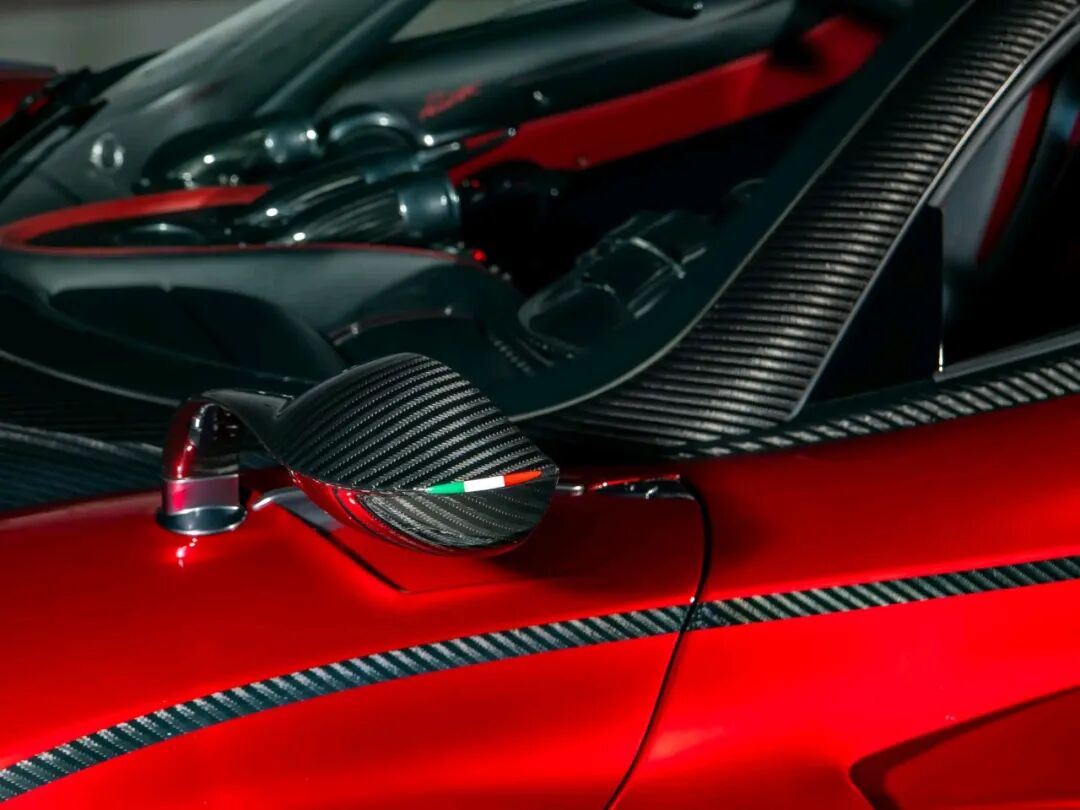 它的外观采用了醒目的迪拜红(Rosso Dubai)涂装,一条定制的裸露碳纤维条纹沿着车身侧面的特征线从前部延伸至后部。碳纤维材料随处可见,包括前分流器、品牌标志性的柳叶形后视镜、车尾和扩散器、车身侧面的下部、挡风玻璃边框以及硬顶和座舱内部。