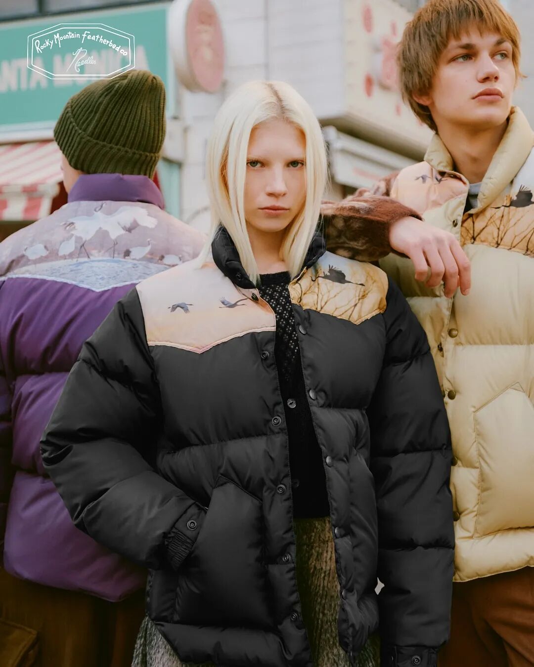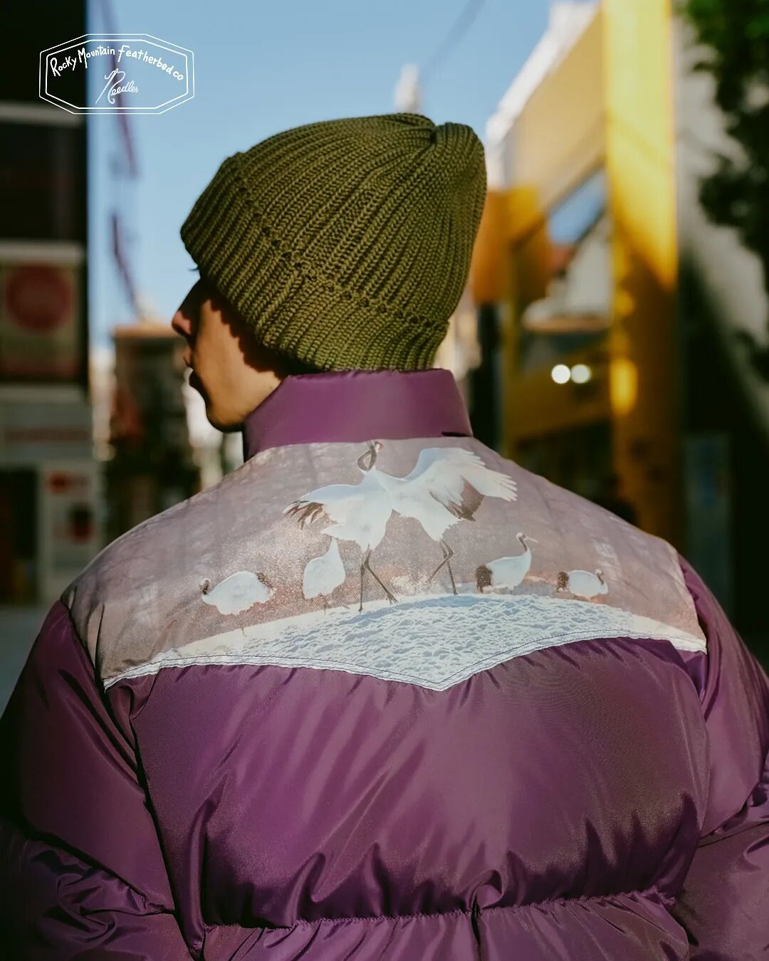 最近 NEEDLES 与 Rocky Mountain Featherbed 展开了惊喜合作,并从 Rocky Mountain Featherbed 经典且标志性的羽绒服和羽绒马甲着手。正当我以为双方会以 NEEDLES 标志性的蝴蝶元素作为点缀 Logo 时,真实情况却完全不一样。双方在肩部设计上用丹顶鹤在雪天起舞的图像取代了原本的皮革材质。而其他方面还是熟悉的配方,尼龙面料、700FP 的欧洲防水羽绒,保暖性和舒适感都是高水平。配色方面两款衣服均有米色、紫色和黑色三种选择,感兴趣的各位根据自己喜欢来购买啦。