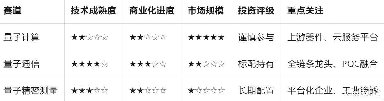 投资逻辑:量子计算是"十年后的颠覆性技术",当前投资属于"期权价值"押注,需极强风险承受能力。重点关注上游核心器件(稀释制冷机、量子芯片)供应商,而非整机厂商。