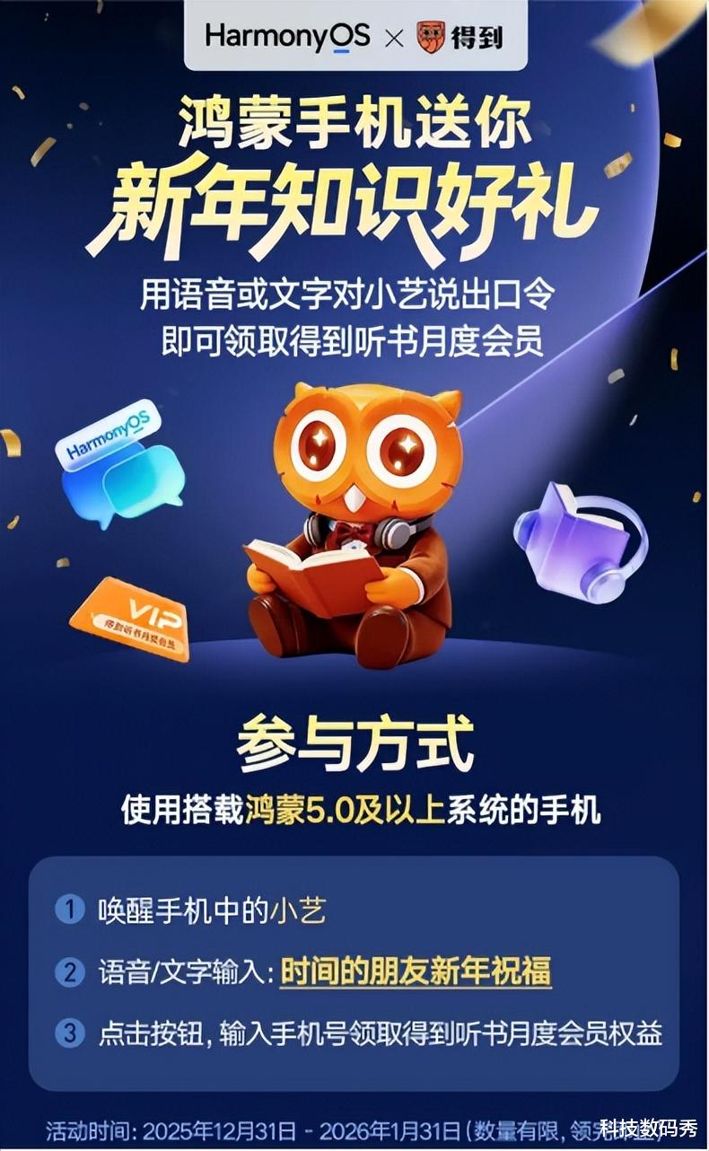 2026年开年,鸿蒙就给用户送上了一份诚意满满的见面礼!在12月31日晚“时间的朋友”跨年演讲中,智慧助手小艺不仅为观众送上了暖心的新年祝福,还同步带来了一份专属于鸿蒙用户的新年福利——得到听书月度会员。只要你是手持HarmonyOS 5.0及以上系统设备的用户就可以领取!