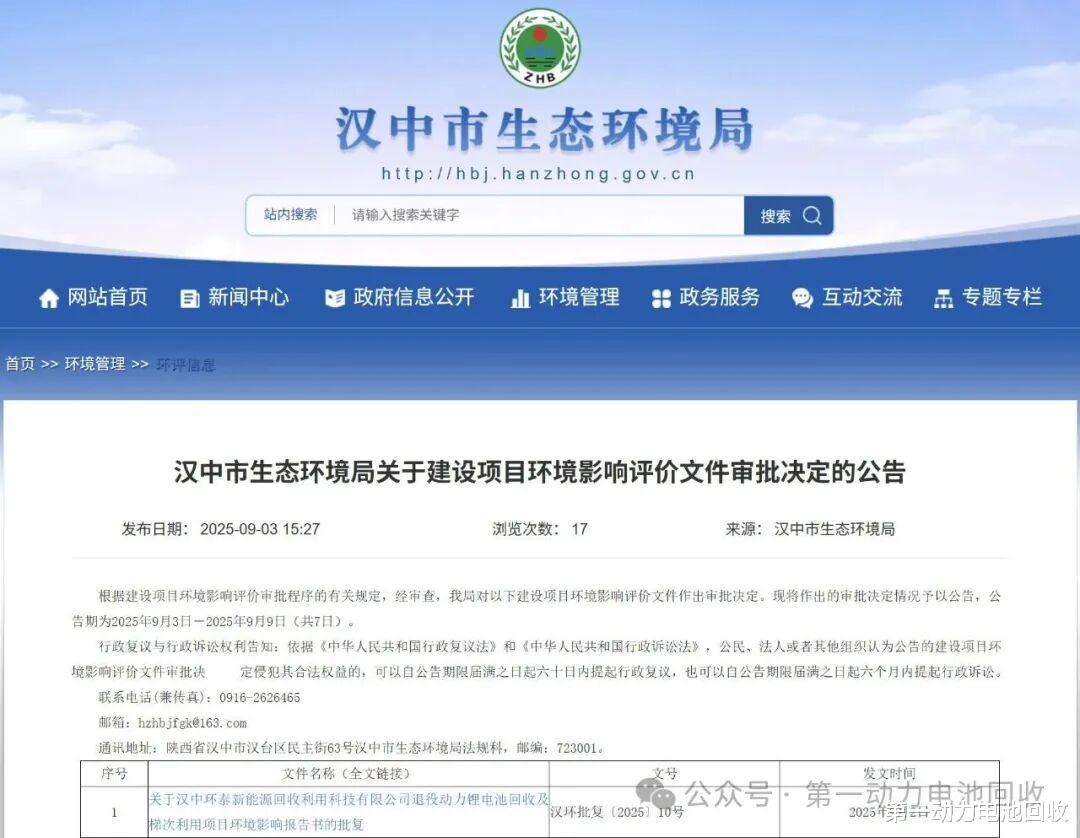 第一动力电池回收消息,近日,陕西省汉中市生态环境局正式批复了《汉中环泰新能源回收利用科技有限公司退役动力锂电池回收及梯次利用项目》的环境影响报告书。该项目落户于勉县循环经济技术开发区内,将建设一条退役动力锂电池生产线回收拆解流水线和一条电池回收拆解梯次利用流水线,年回收处理能力达2.1万台,计划购置约60台相关生产设备。项目总投资12800万元,其中环保投资38.2万元,标志着陕西省在新能源汽车产业链闭环建设上迈出重要一步。