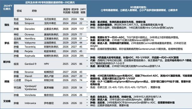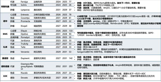 MNC重磅药物专利悬崖即将到来,BD需求分析 备注:专利到期时间是指核心化合物专利到期时间 据中信建投医药