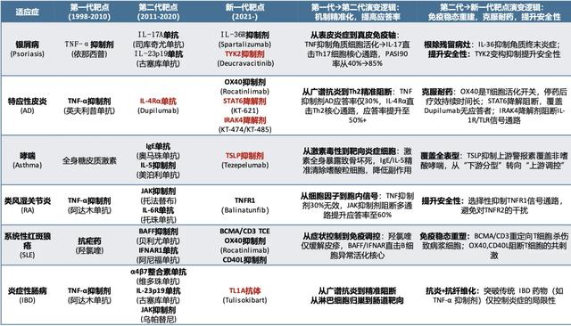 2024年自免领域Dupixent、Skyrizi、Stelara均超过百亿美元销售额。据中信建投,免疫炎症疾病的核心机制是免疫系统失衡误伤自身组织而导致慢性炎症,而关键信号通路(如细胞因子网络)往往调控多器官炎症,使得单药能够覆盖多病种,具有广谱性,随着新兴靶点STAT6、IRAK4、TL1A、TSLP、PDE3/4逐步验证,TCE多抗临床数据逐步读出,下一代百亿美元分子呼之欲出。