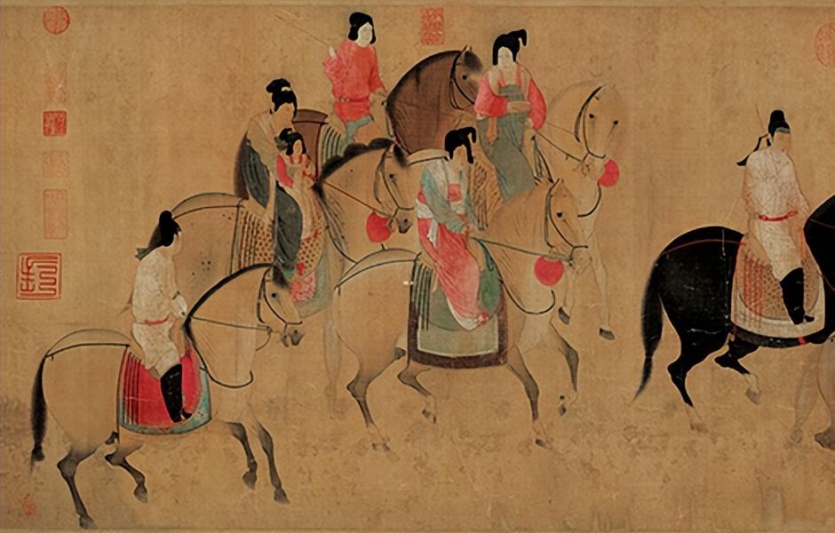 三、人物描绘与技法在人物描绘上,张萱注重表现人物的神态和气质。他通过精细的线条和丰富的色彩,生动地描绘了虢国夫人及其眷从的服饰、仪态和表情。虢国夫人作为画面的中心人物,被描绘得雍容华贵、仪态万方;侍女们则各具特色,有的活泼俏皮,有的端庄娴静,共同构成了一幅生动的唐代贵妇出游图。