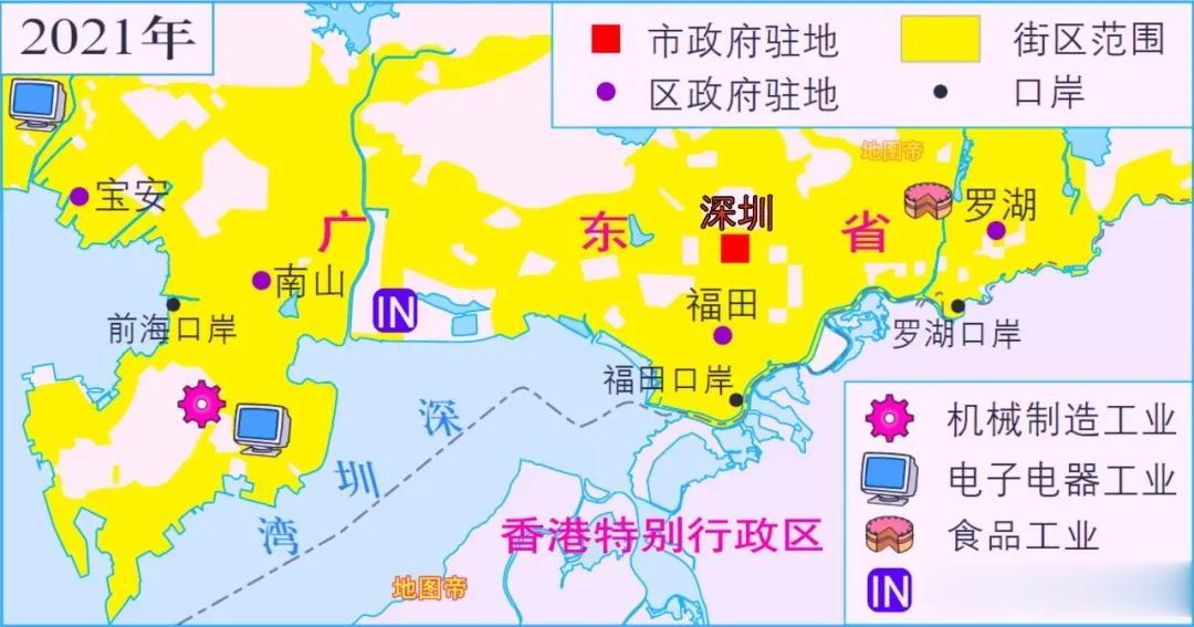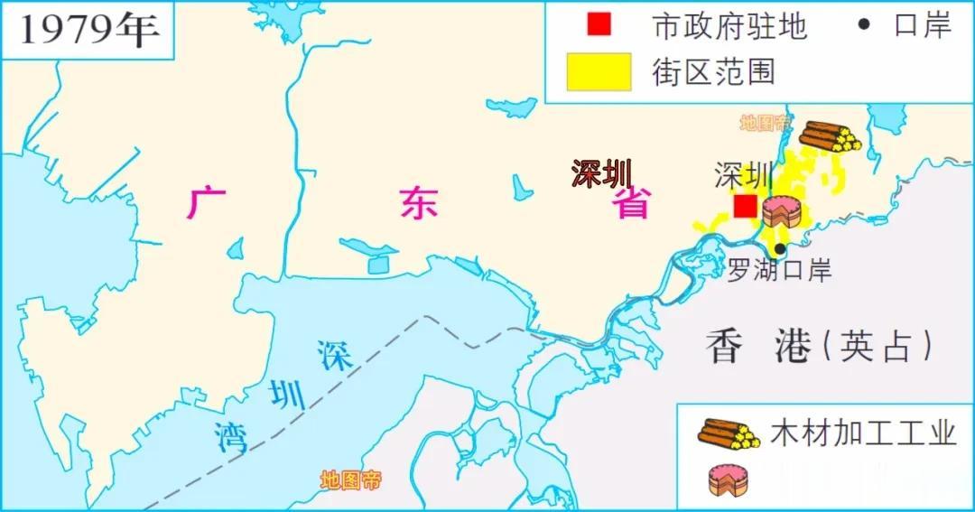 这个圈就是深圳,当时将宝安县升级为深圳(因河得名),与香港隔着一条深圳河。深圳是我国经济发展的试验田,属于“摸着石头过河”,为迎接香港回归做准备。