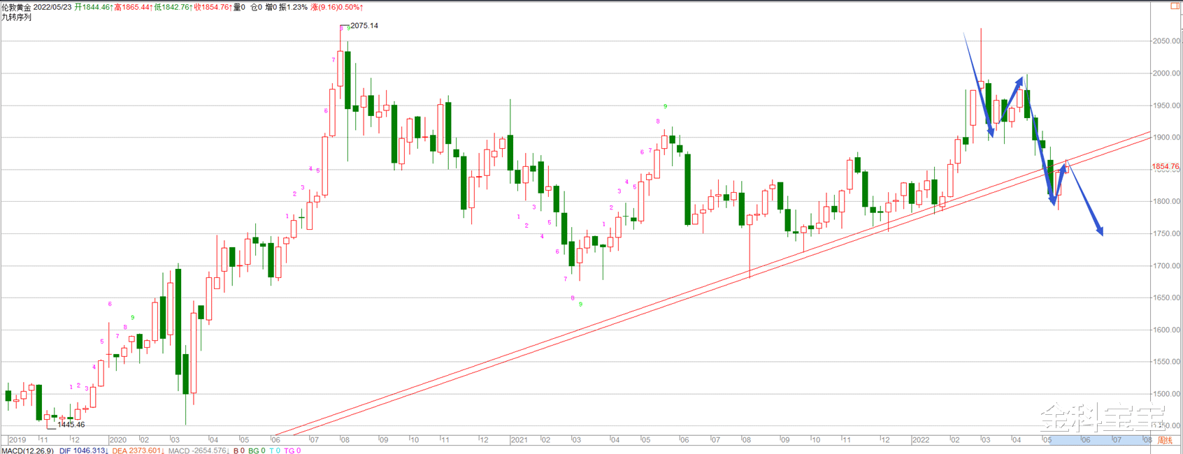 黄金要想确认多头趋势,最起码的一点就是要破位周线图趋势压制点这里才行,否则黄金还会再次探底下来。