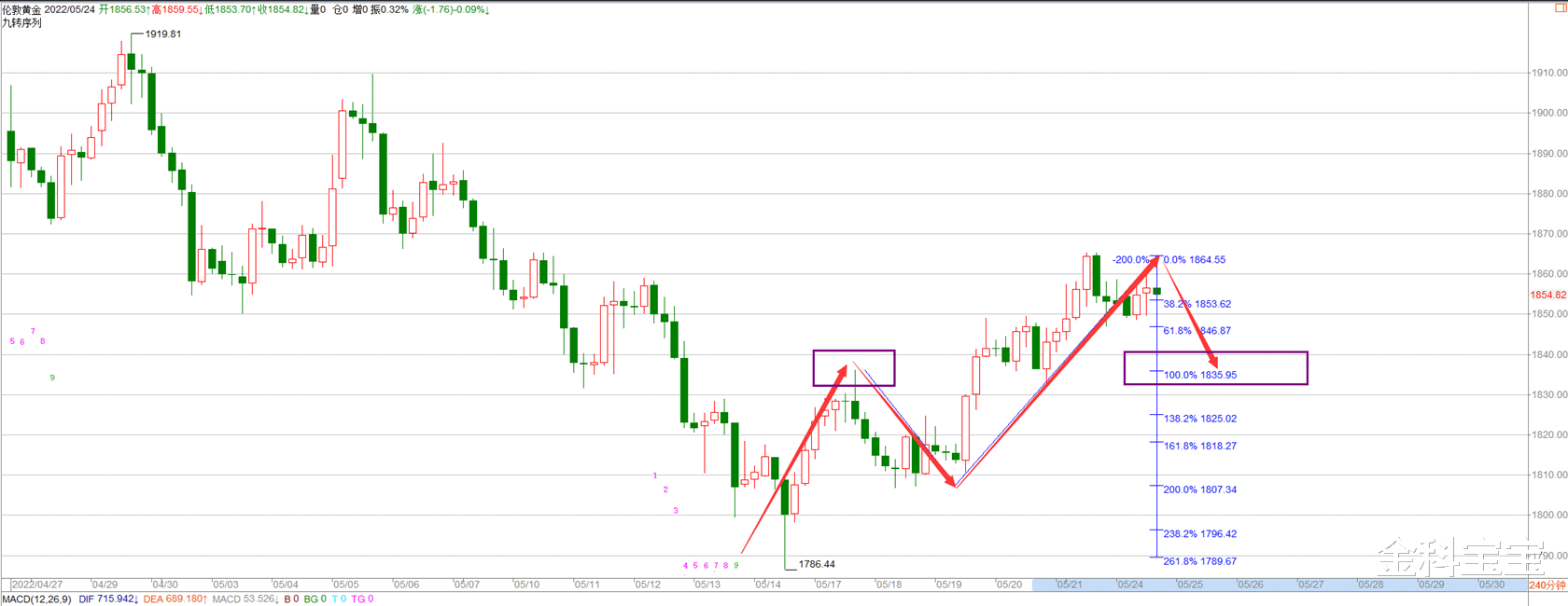 从4小时这里来看,我们可以看到从1810-1865这里就处于第三浪的反弹趋势,如果说确认1865这里是三浪顶部位置,那么接下来会出现第四浪的回调浪。