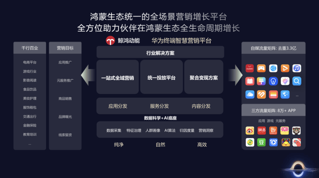 在数据层,不但有一个账号打通用户跨终端全旅程链路的技术供给,还以「鲸鸿指数」「鲸鸿万象」等数据产品的形式,提供数据解决方案作为营销服务的配套,为开发者解决创意和效率上的痛点。