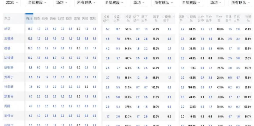 后卫线的徐杰场均能够砍下16.3分4.2篮板7助攻,投篮命中率高达53%,其中三分球命中率高达48.8%,场均能够投中3.5记三分球。更为难得的是,他还能场均抢下4.2个篮板球,徐中锋名副其实。