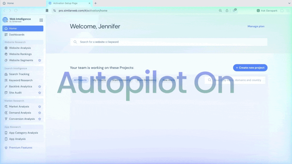 2️⃣ Autopilot 自动驾驶模式:让 AI 替你上网你只需设定目标,Genspark 就能自动浏览信息源、收集数据、访问高级数据库,甚至完成复杂网页任务。信息收集、比价分析、内容筛选,全都自动搞定。