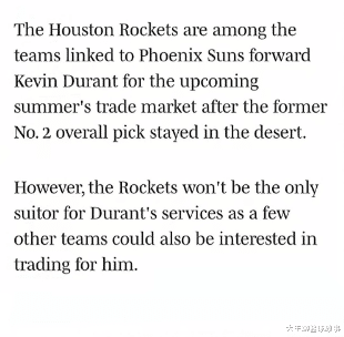 据天海区一家体育画报爆料,今年夏天的交易市场上,处于同期竞争的火箭、独行侠以及灰熊,都试图在交易中得到布兰特。而太阳队在本赛季中期交易截止日时,处境颇为尴尬。一方面,球队既没能成功换来巴特勒,为冲击总冠军补充关键球星;另一方面,也没有将杜兰特交易出去,开启拆队重建的进程,可谓陷入了双输的局面。