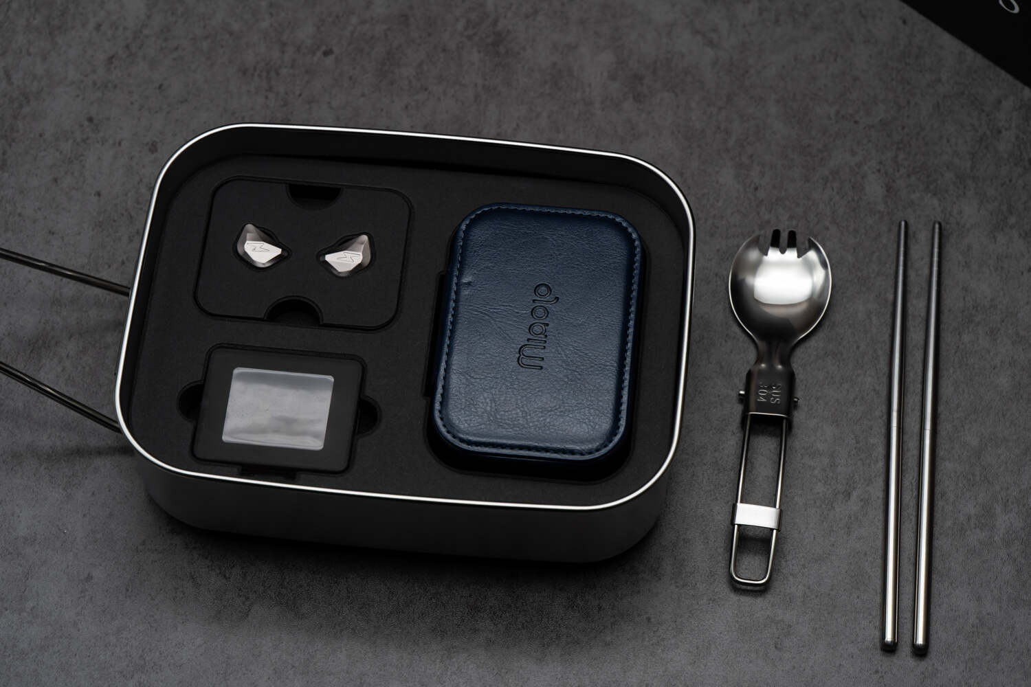 虽然这类简评我一般是跳过开箱的,但由于DIOS这塞子过于“整活”,还是得提一下。DIOS的外包装是黑色的大方盒子,外观神似某奢侈品,甚至还配了一个同色的手提袋;然而开箱后里面却是一个不锈钢饭盒,以及同样材质的饭盒把手和一把勺子、一双筷子——妥妥的“吃饭家伙”;打开后,DIOS耳机腔体、皮质收纳盒和其他配件分别放置于不同空间。以千元出头的价格而言,不论是这个“整活饭盒”还是收纳盒、线材的配置都是相当有诚意的了。