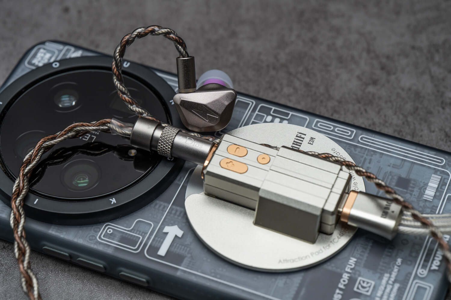 DIOS的腔体之前已经见过,面板是带有光影切割视觉效果的多个连续不规则多面体,整个形状是一个“圆角梯形”,体积很小,面板中央有一个内凹的闪电图案。整个腔体是CNC航空铝合金而成,磨砂质感的外表十分精致手感也很棒。由于体型小巧导致了很轻便的重量,佩戴压力极小,搭配合适的耳套基本可以实现无感佩戴。单就这个外观与工艺而言我的认可度是很高的,兼顾了美观、质感和舒适。
