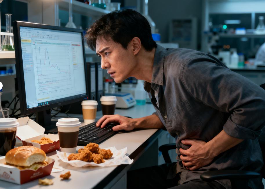 2016年,27岁的徐俊凯是一名来自上海某理工大学的在读博士生。导师项目繁重、毕业压力大,让他几乎每天都不得不待在实验楼到凌晨,通宵赶论文是常态。而泡面、外卖、咖啡就成了三件“续命法宝”,为了提神,徐俊凯甚至一天能喝五六杯咖啡,饿了就啃面包、炸鸡,最常说的一句话是“能量优先,营养以后再说”。那时候的他,年轻、拼命,也坚信身体抗一抗就过去了。徐俊凯没有想到,这些看似平常的小习惯,正在默默地蚕食着自己的胃。