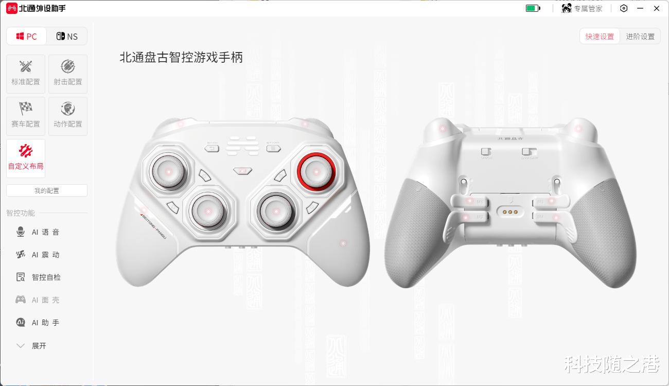 非常智能的一点是,当连接上北通游戏大厅,手柄模块更换完成后,可以在软件中对组件模块进行设置。手柄能自动识别当前模块组合状态,对应的配置会保存,这个细节我觉得做得比较贴心,降低了玩家在游戏前的切换成本。