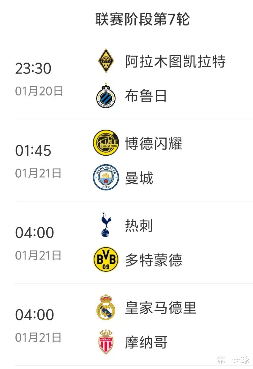 博德闪耀VS曼城,博德闪耀唯一的优势也许就是寒冷的主场天气了,但曼城赢球无忧,比分预测为0比2,1比2,1比3。热刺VS多特,热刺和多特目前均积11分,排名第11位和第10位,都有冲进前8的机会,两队都是有名的神经刀,这场比赛基本五五开,比分预测为2比1,1比1,1比2。