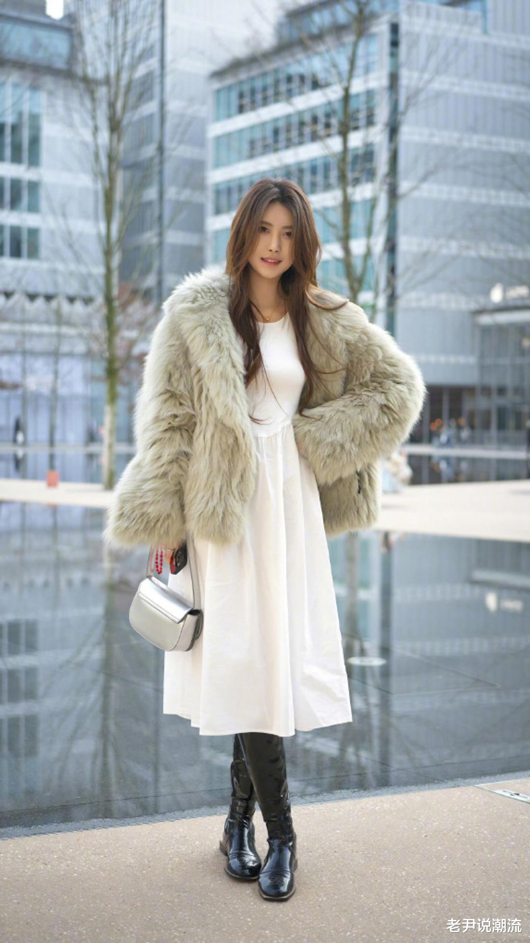 清秀的模特美女选择的是纯白色宽松连衣裙外搭一件浅卡其色毛绒皮草大衣自带贵气,脚上除了高跟鞋还可以配黑色亮面长靴,表现出了温柔浅色系加上酷感黑靴的混搭,既有柔美的气质,又又利落感,风格优雅又不失个性美。适合三季都能穿。