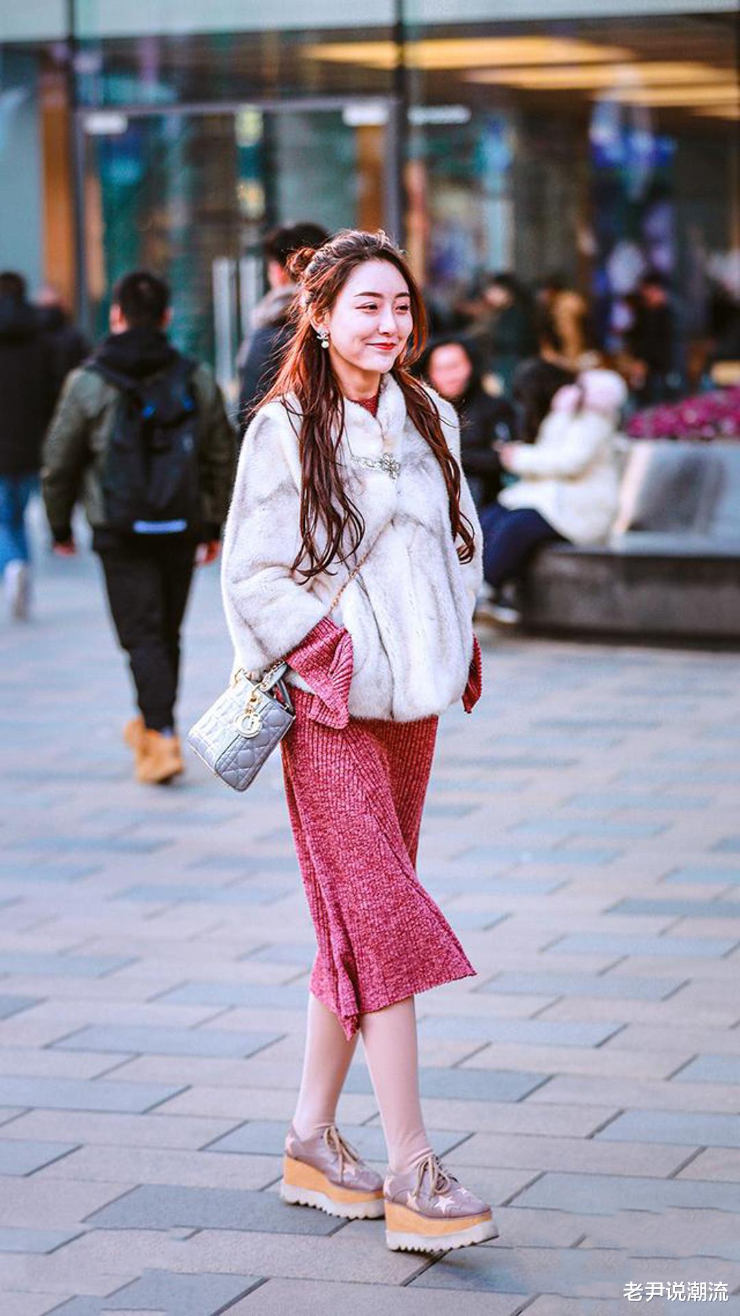 微胖的女生看起来二十多岁,身上是白色貂皮短款外套,下装玫红色针织鱼尾长裙;脚是一双浅粉色厚底松糕鞋, 撞色搭配突然袭击你的视线,厚底鞋带点甜酷感,风格优雅活泼,亮眼的搭配又显气质,春秋上街也是很好的。
